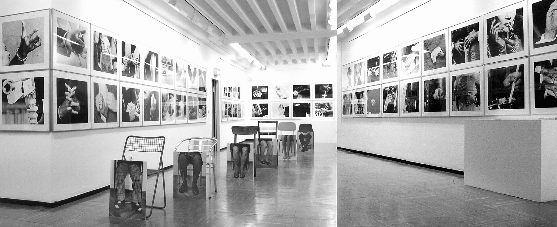 "Die Stuhlinstallation ist Teil der größeren Fotoinstallation "Konsumtionen schwarz-weiß II", zu der die Serie "Symbol Hand Idol" und die Fotoobjekte "Traumkissen - night on TV" gehören. Gemeinsam wurden sie in der 2002 in der Kunsthalle Darmstadt ausgestellt." - Ute Döring