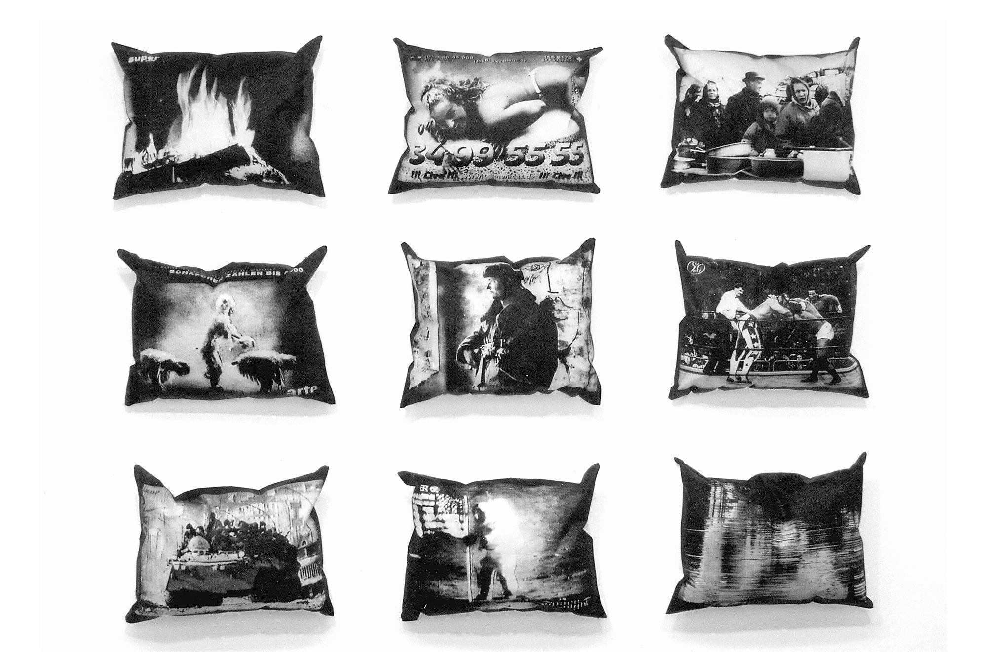 "Traumkissen - night on TV, Tschetschenien 1999", Fotoobjekt, Handabzug auf Fotoleinen, 9tlg., je 50 x 60 cm, 2000
